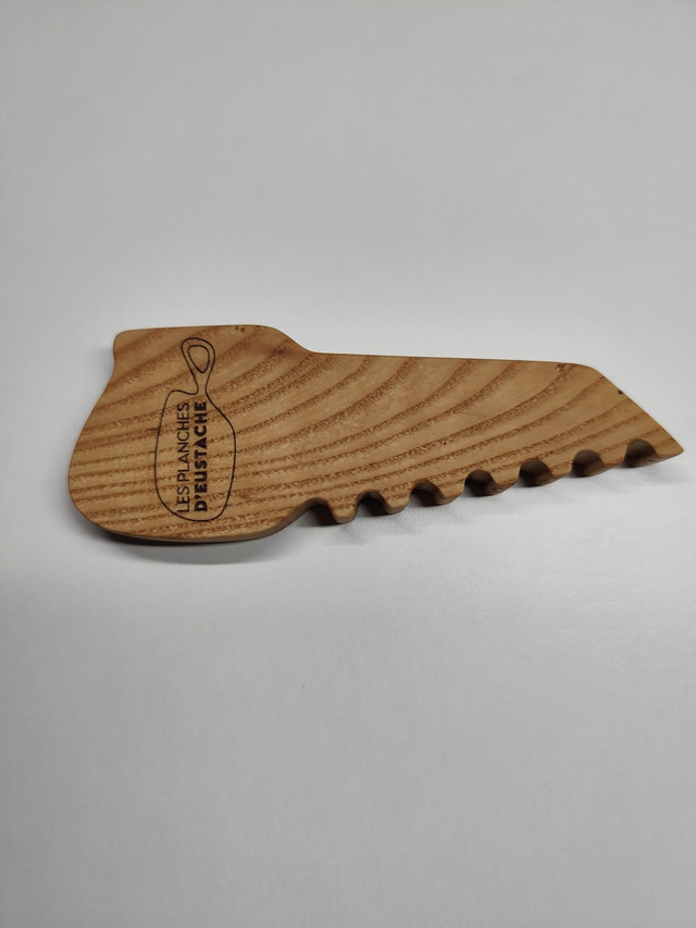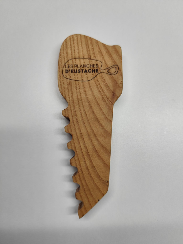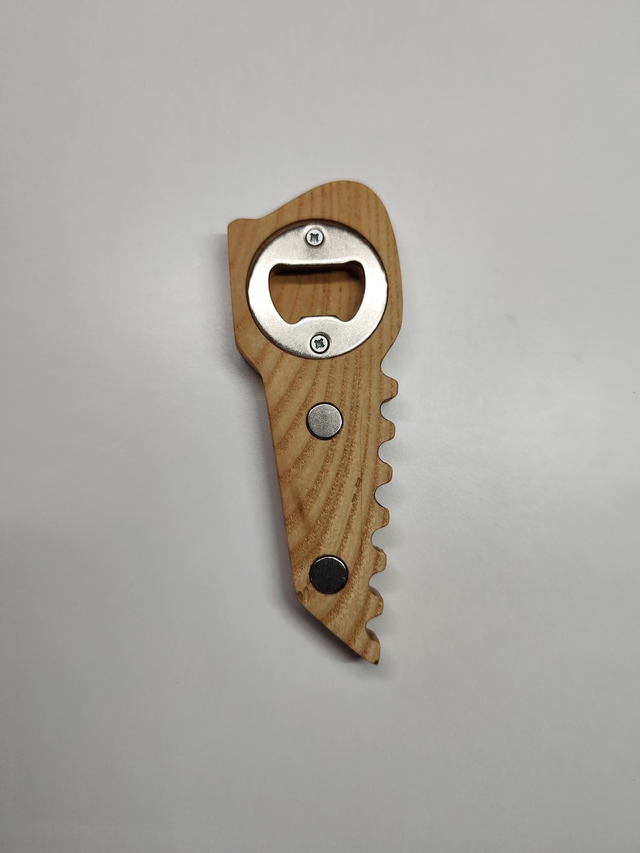 DĂ©capsuleur artisanal façonnĂ© en frĂȘne massif , avec une forme de scie đȘ Ă main âđŒ aussi originale que pratique.