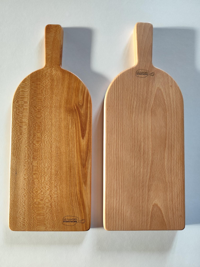 Planche à découper en orme massif ou frêne, fabriquée artisanalement à la main en Haute-Savoie. Bois noble et résistant aux veinages uniques, poncé à la main, huilé à l’huile minérale alimentaire et ciré à la cire d’abeille naturelle.