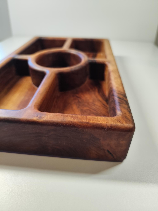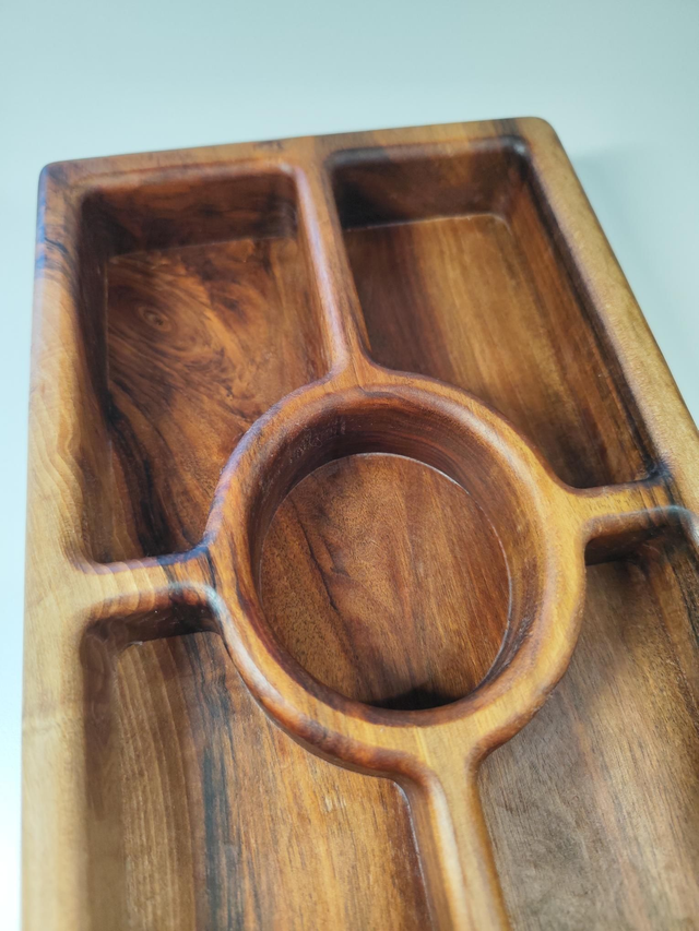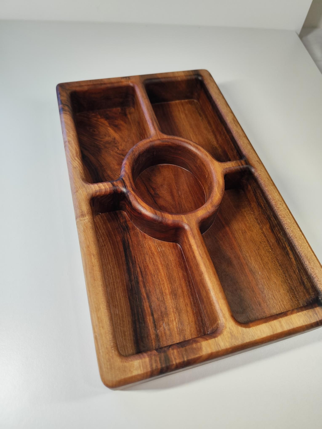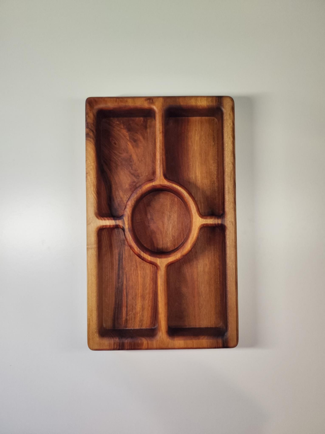 Sculpté dans un bloc de bois unique, il présente 5 compartiments parfaits pour servir apéritifs, fruits secs, olives, fromages ou douceurs.