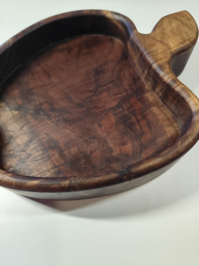 ÉlĂ©gant et original, ce grignotier / vide-poche artisanal est taillĂ© dans un bloc de noyer amĂ©ricain Bastogne ondĂ©.