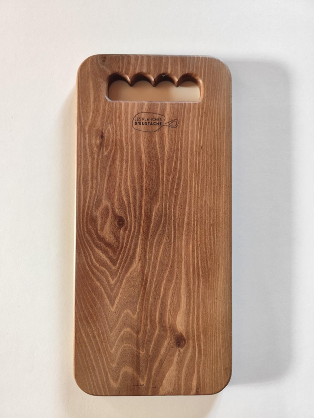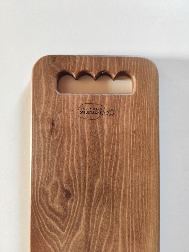 Planche à découper en noyer massif, fabriquée artisanalement à la main en Haute-Savoie. Bois noble aux teintes profondes et veinages élégants, poncé à la main, huilé à l’huile minérale alimentaire et ciré à la cire d’abeille naturelle.