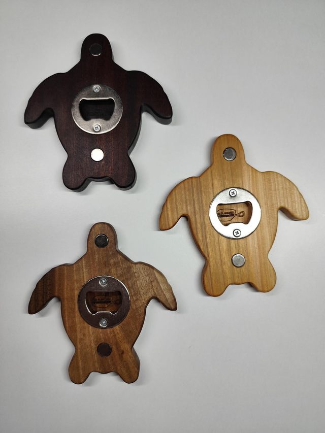 Décapsuleur artisanal façonné en bois massif , avec une forme de tortue aussi originale que pratique.